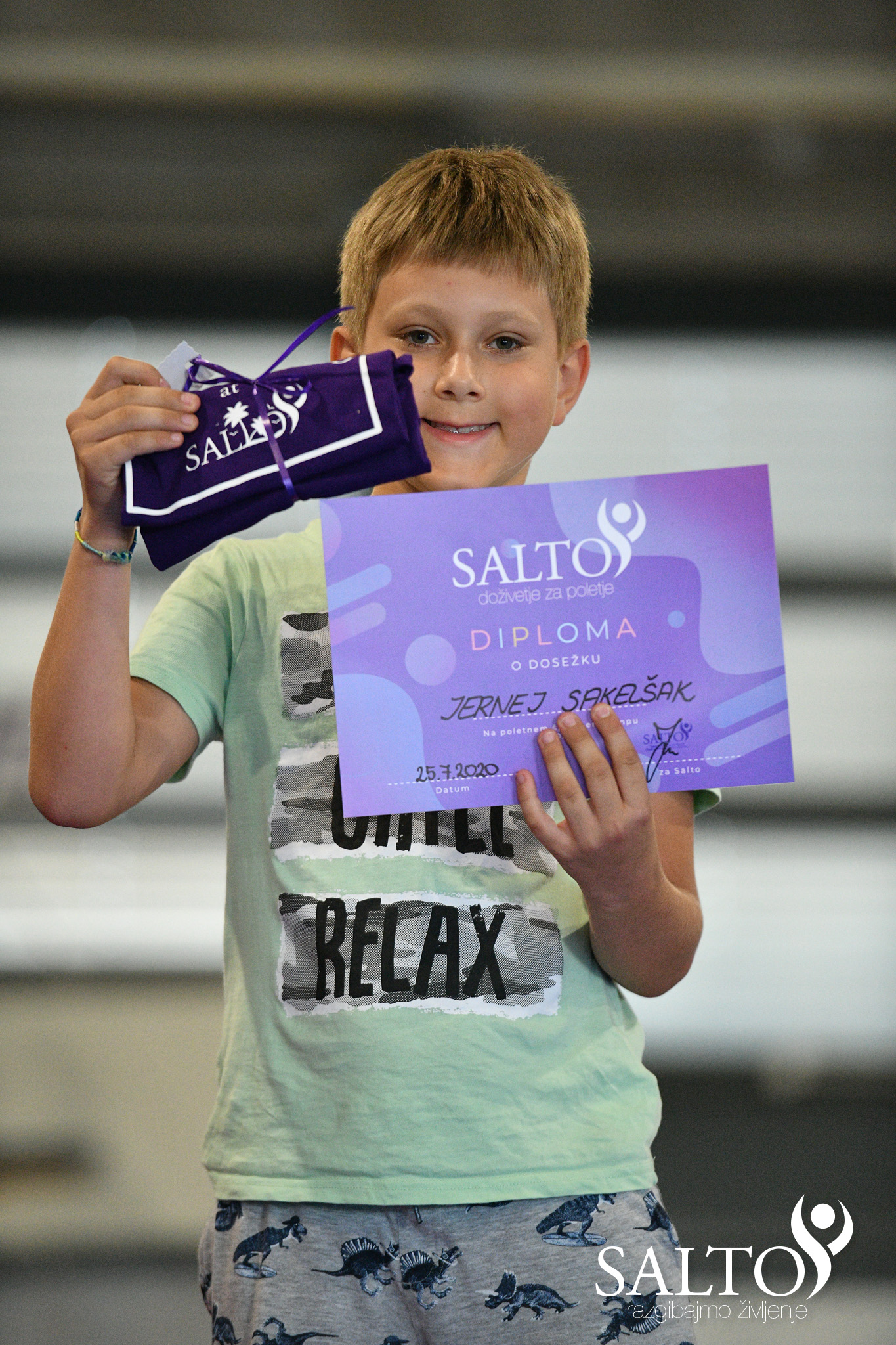 Vsega lepega je nažalost enkrat konec. Tudi naš Salto poletni kamp se je tako zaključil. Letos smo se imeli zelo lepo. Z lahkoto lahko povemo, da so naši otroci pač ZAKON :)V petek smo imeli še zaključni pižama party na katerem smo plesali, se igrali in navijali pri štafetnih igrah. Za konec večera še film in že smo drnjohali :)Sobota je bila namenjena zaključku kampa, staršem smo pokazali kako pridno smo cel teden telovadili, prejeli smo diplome in majčke. Zmagovalka Lana pa še velikega flamingota :)Naslednji teden pa se bomo spet družili na delavnicah. Tokrat je na vrsti delavnica športne gimnastike. Prideš? 😉